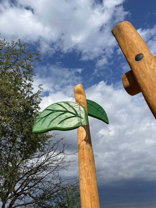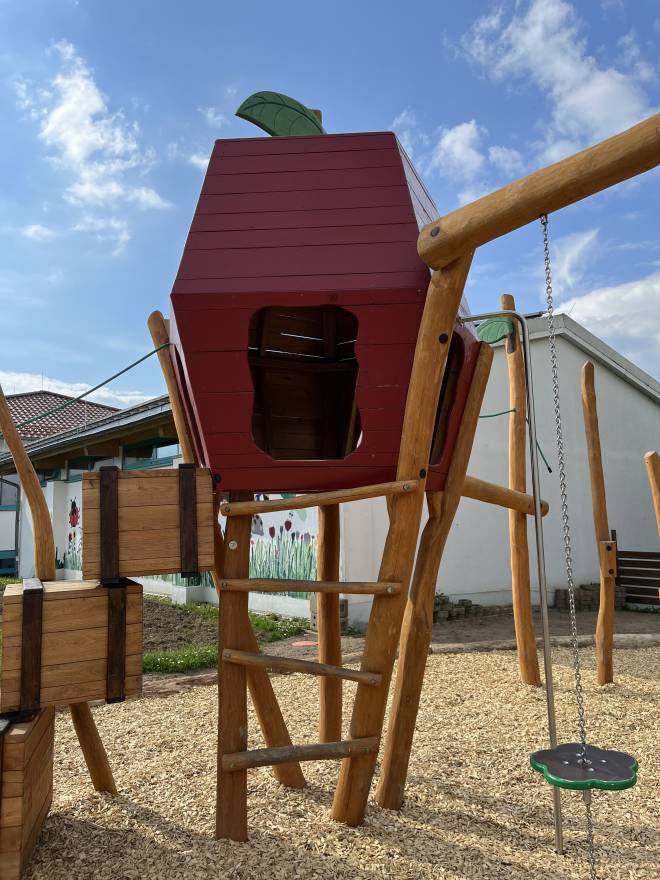 Einmal hoch hinaus in den Apfel-Turm, kurz durchatmen – und dann geht das Abenteuer weiter: Die Spielanlage Apfel ist ein abwechslungsreicher Spielparcours, der Kinder immer wieder neu zum Ausprobieren einlädt. Über den Leiteraufstieg gelangen kleine Entdecker nach oben, testen ihren Mut auf dem Balancierbalken mit Seilhandlauf und hangeln sich an den Römischen Ringen von Griff zu Griff. Wer es lieber knifflig mag, wählt die Parcourshölzer oder die Schlaufenbrücke aus Herkulesseil – hier werden Gleichgewicht, Koordination und Teamwork ganz spielerisch trainiert.