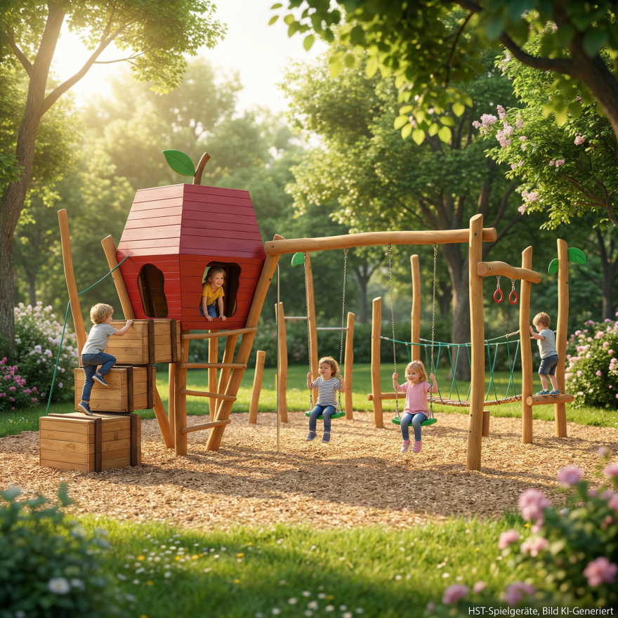 Das Highlight ist der 5-Eck-Turm in Apfelform: ein echter Hingucker, der Fantasie weckt – heute Apfelhaus, morgen Burg, übermorgen Geheimversteck. Und wenn die Energie wieder nach unten drängt, sorgt die Edelstahlrutschstange für das kribbelige Bauchgefühl, das Kinder so lieben. Bei HST-Spielgeräte steht dabei genau dieses Zusammenspiel im Mittelpunkt: draußen spielen, Neues wagen und dabei ganz nebenbei lernen.