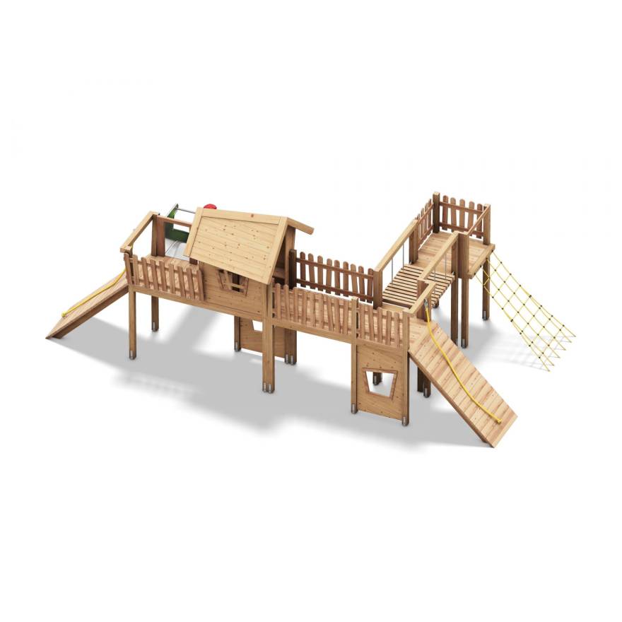 Die natürliche Holzoptik aus Lärche/Douglasie fügt sich harmonisch in Grünflächen ein, während verzinkte Stahlteile und Edelstahl dort Stabilität bieten, wo es darauf ankommt. Dank durchdachter Wegeführung finden hier bis zu 30 Kinder gleichzeitig Platz für Rollenspiel, Teamaktionen und kleine Wettläufe - ideal für Einrichtungen, die Wert auf vielfältige Bewegung und langlebige Qualität legen.