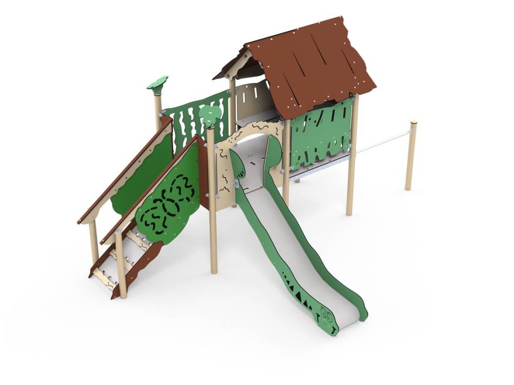 Hier entsteht ein Lieblingsplatz zum Entdecken, Klettern und Pausemachen: Die Spielanlage Rios kombiniert ein erhöhtes Spielhaus mit Tisch und Bänken, eine kinderfreundliche Rampe und eine sanft laufende Rutsche zu einem vielseitigen Erlebnisraum. Schon die Jüngsten ab 2 Jahren erreichen das Obergeschoss über die Rampe, blicken von dort über den Platz, spielen ""Kaufladen"" oder teilen das Lunchpaket. Anschließend geht’s über die Rutsche wieder hinunter - ein tolles Gefühl, bei dem Kinder Gleichgewicht, Mut und das Einschätzen von Geschwindigkeit trainieren. HST-Spielgeräte stellt bei Rios das neugierige Spielen in den Mittelpunkt: Jede Bewegung zeigt direkt, wie Schritt, Griff und Schwung zusammenwirken - Ursache und Wirkung werden erlebbar, soziale Kompetenzen wachsen, und die Fantasie bekommt täglich neue Impulse.
