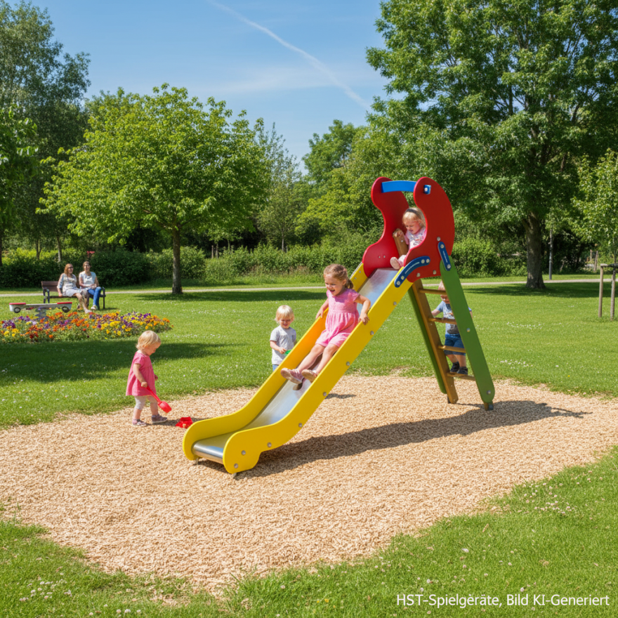 Dank der robusten, wartungsarmen Materialien ist die Rutsche wie gemacht für den Alltag in öffentlichen Außenbereichen. Die Rutschfläche aus Edelstahl fühlt sich angenehm glatt an und macht jede Abfahrt schnell und gleichmäßig. Die farbigen Seitenwangen aus durchgefärbtem HDPE setzen fröhliche Akzente, während Leiter und Holzbauteile aus Lärche und Esche den natürlichen Look unterstreichen. So wird aus Bewegung spielerisches Lernen - bei HST-Spielgeräte steht genau diese Kombination aus Abenteuer, Motorik und sicherem Ausprobieren im Vordergrund.