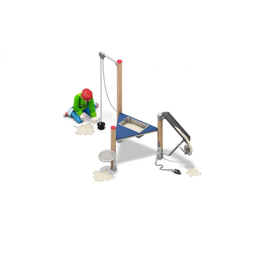 Besonders schön ist die offene Spielidee dieses Sandspielgeräts. Es gibt nicht nur einen festen Ablauf, sondern viele Möglichkeiten, das Gerät immer wieder neu zu nutzen. Heute wird Sand in kleine Behälter gefüllt, morgen durch ein Sieb sortiert und anschließend über eine Rinne weitergeleitet. Daraus entstehen kleine Baustellen, Matschküchen, Transportspiele oder fantasievolle Mini-Welten, in denen Kinder ihre eigenen Ideen umsetzen. Genau diese Offenheit sorgt dafür, dass der Spielwert langfristig hoch bleibt und Kinder immer wieder mit Begeisterung zurückkommen.