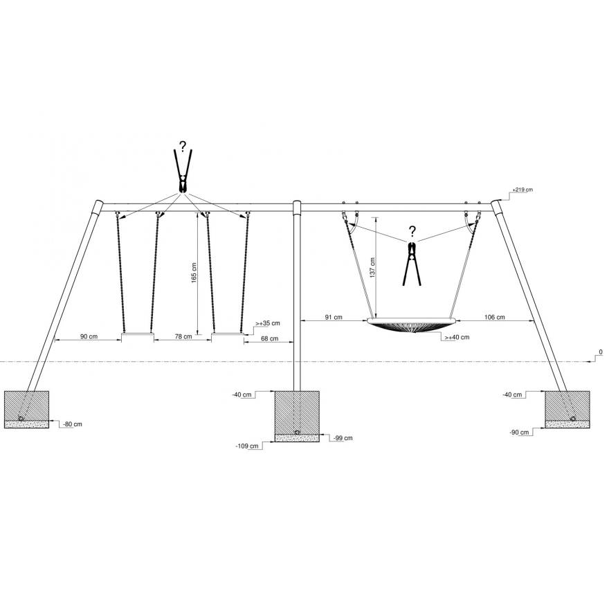 Das komplett aus Metall gefertigte Schaukelgestell ist besonders robust und ideal für stark frequentierte Bereiche wie Schulhöfe, Kindergärten und öffentliche Spielplätze. Sowohl der Kopfbalken als auch die Standpfosten bestehen aus stabilem, feuerverzinktem Metall und sind auf eine lange Lebensdauer im Außenbereich ausgelegt. Die klare Konstruktion lässt sich gut in moderne Spiellandschaften integrieren und macht die Kombischaukel schnell zum optischen Mittelpunkt jeder Anlage.