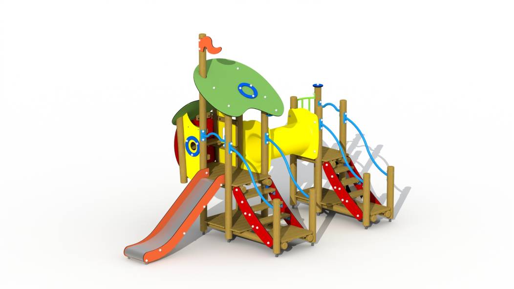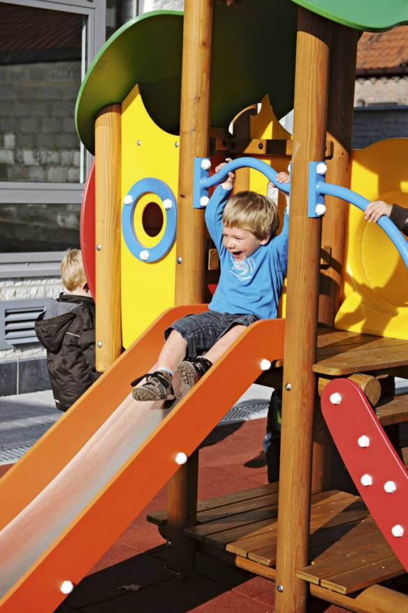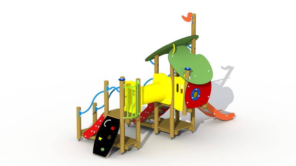 Die farbenfrohen HDPE-Platten, die runden Lärchenholzpfosten und die polyesterbeschichteten Metallteile machen das Spielgerät nicht nur optisch attraktiv, sondern auch besonders langlebig und pflegeleicht. Blumenförmige Schutzkappen decken alle Verschraubungen ab, die Edelstahlrutsche bleibt auch bei intensiver Nutzung robust und leicht zu reinigen. Damit eignet sich die Anlage ideal für Kindergärten, Krippen, öffentliche Spielplätze und alle Orte, an denen Kinder viel Zeit im Freien verbringen.
