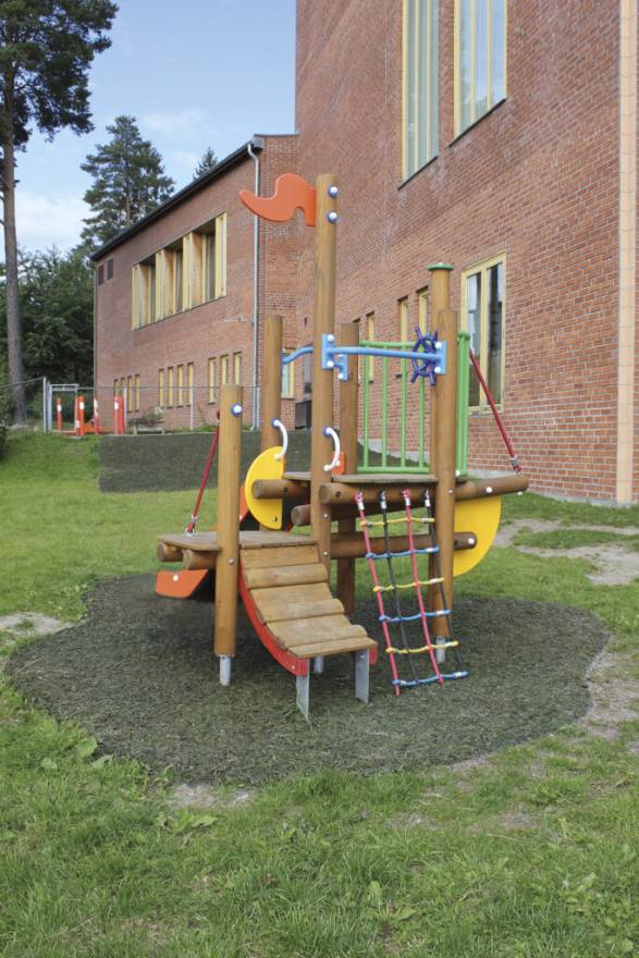 Damit die Spielanlage den Alltag in Kita, Krippe oder auf öffentlichen Spielplätzen lange mitmacht, ist sie besonders robust konstruiert. Runde Lärchenholzpfosten mit Pfostenschuhen bzw. verzinkten Metallfüßen sorgen für einen stabilen Stand. Geländer, Griffe und Stangen aus polyesterbeschichtetem Metall liegen gut in kleinen Händen, alle Schrauben werden von blumenförmigen Kunststoffkappen abgedeckt. Die Rutschbahn mit Edelstahlbelag und HDPE-Seitenwänden ist widerstandsfähig und leicht zu reinigen, Seile und Netze aus verstärktem Polypropylenseil sind für den täglichen Einsatz im Freien ausgelegt.