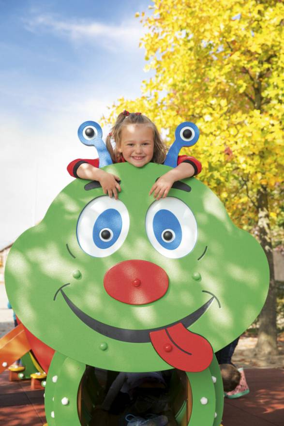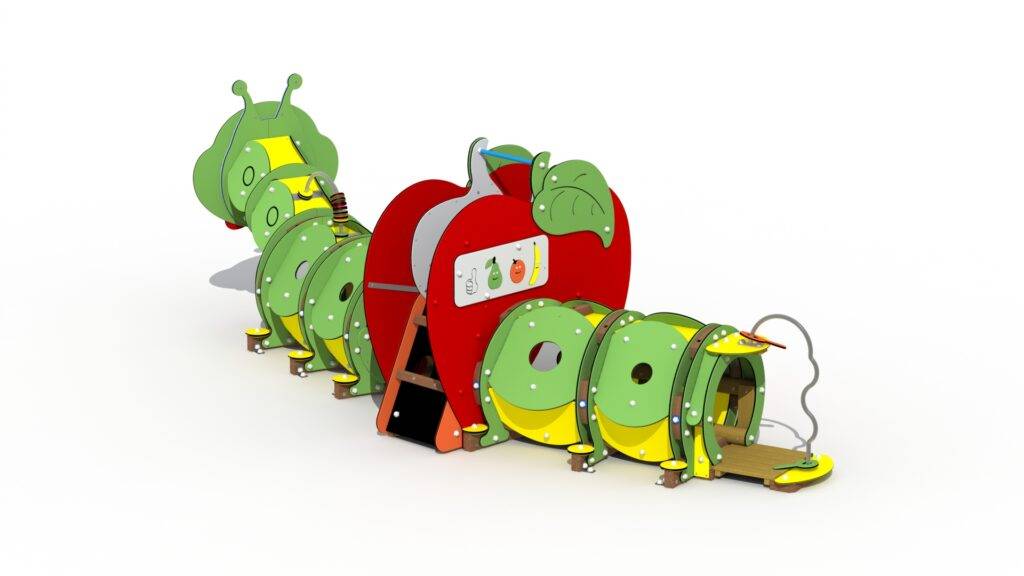 Spielfunktionen Kriechen durch den Raupenkörper, Klettern, Rutschen im Apfel