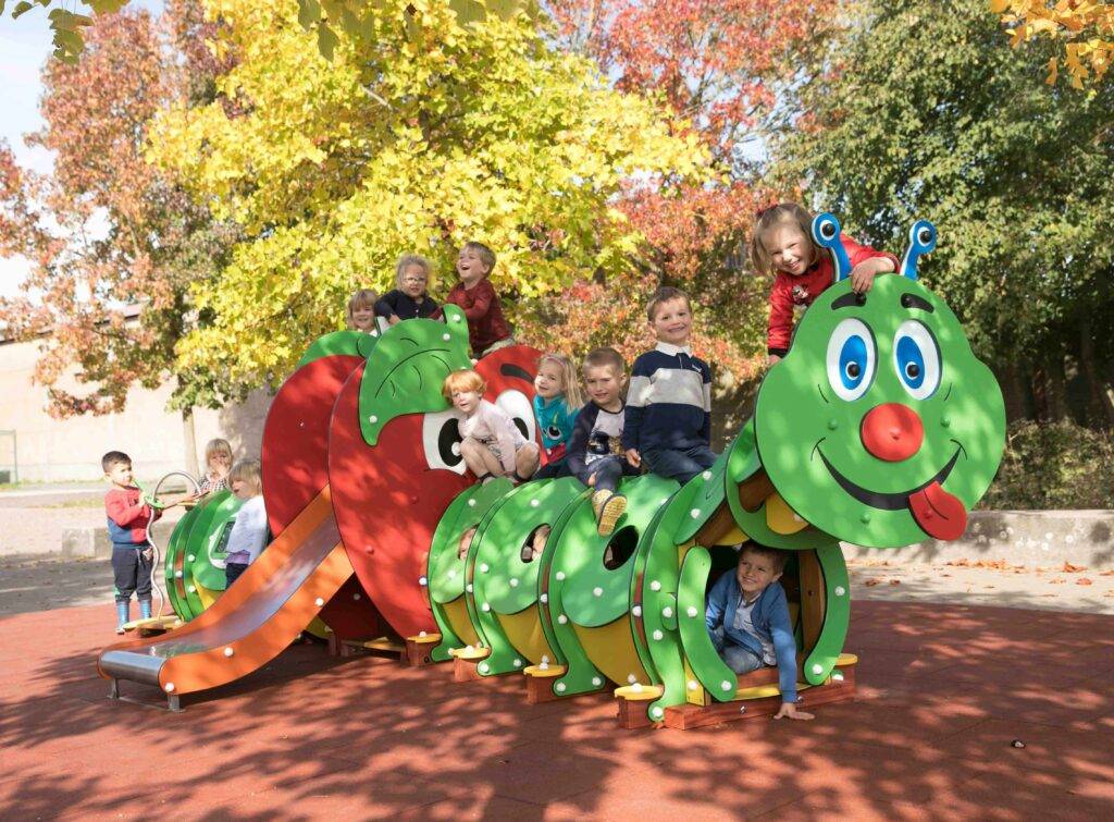Die liebevolle Gestaltung mit der lachenden Raupe und dem großen Apfel macht sofort Lust aufs Spielen und vermittelt nebenbei eine positive Botschaft: Obst gehört einfach dazu. Kinder erleben, dass gesunde Ernährung etwas Fröhliches und Selbstverständliches ist. In Kombination mit weiteren Geräten aus der Themenwelt rund um Raupe und Apfel entsteht ein eigener kleiner Spielbereich, den HST-Spielgeräte bewusst so ausrichtet, dass Bewegung, Wahrnehmung und gesunder Lebensstil Hand in Hand gehen.