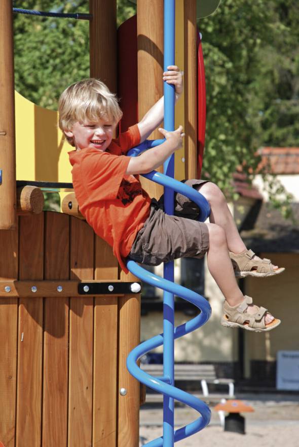 Über eine leicht begehbare Treppe mit Metallgeländer, einen Kletterbogen oder die rutschfeste Felswand mit Kunststoffklettergriffen gelangen die Kinder auf die 93 cm hohe Plattform. Von hier geht es mit viel Schwung über die Edelstahlrutsche wieder nach unten. Wer noch höher hinaus will, steigt weiter über die integrierte Wendeltreppe hinauf auf die oberste Ebene in 1,91 m Höhe. Dort warten ein Kunststofflenkrad, ein Teleskop und ein Drehspiel auf kleine Entdeckerinnen und Entdecker. Besonders mutige Kinder „sausen“ über den Metallspiral-Feuerwehrmast zurück zum Boden – ein riesiger Spaß, der gleichzeitig Körperspannung und Mut trainiert.