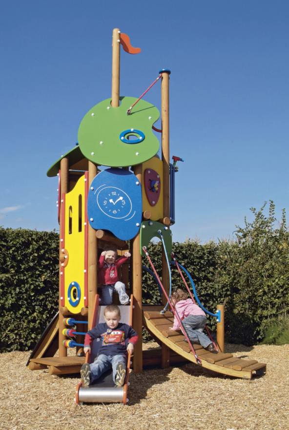 Die bunten HDPE-Wandelemente und das zweifach geschwungene Dach verleihen "Dornröschen" die Optik eines liebevoll gestalteten Märchenhauses. In Kombination mit den stabilen Lärchenholzpfosten entsteht eine Anlage, die perfekt zu den hochwertigen Außenspielgeräten von HST-Spielgeräte passt. Ob im Kindergarten, auf dem öffentlichen Spielplatz oder in einer Freizeitanlage – hier wird geklettert, balanciert, gezählt, beobachtet und fantasiert, sodass Bewegung und Köpfchen gleichermaßen gefordert sind.