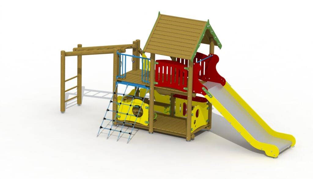 Über die bequeme Treppe, ein Kletternetz oder weitere Anbauelemente geht es hinauf auf die großzügige Spielplattform mit Satteldach. Von hier starten Kinder ihre Rutschpartien über die breite Rutschbahn mit Edelstahlbelag oder hangeln weiter zur seitlich montierten Kletterstrecke. So werden Gleichgewicht, Kraft und Koordination ganz spielerisch trainiert – und gleichzeitig das Miteinander in der Gruppe gefördert.