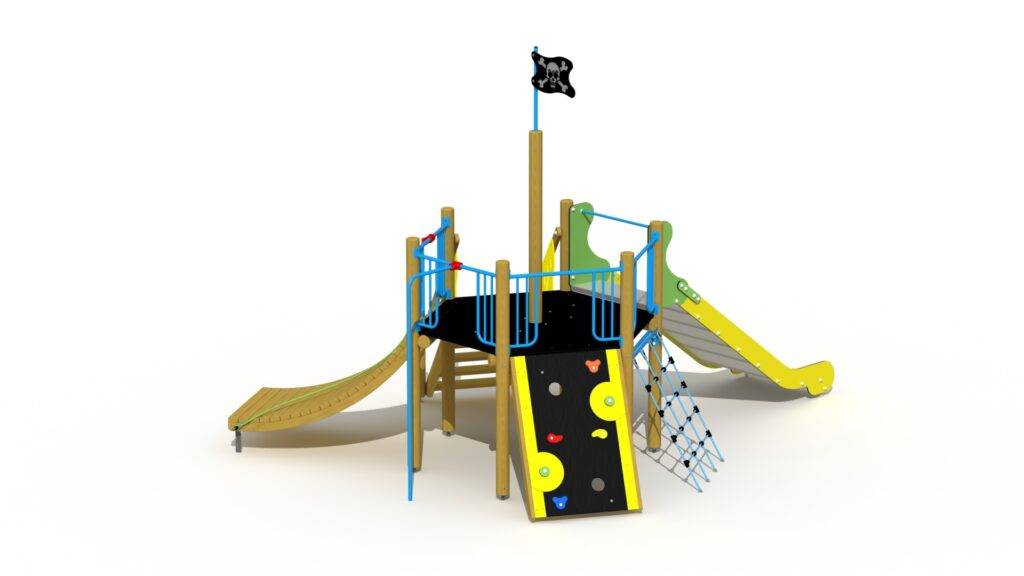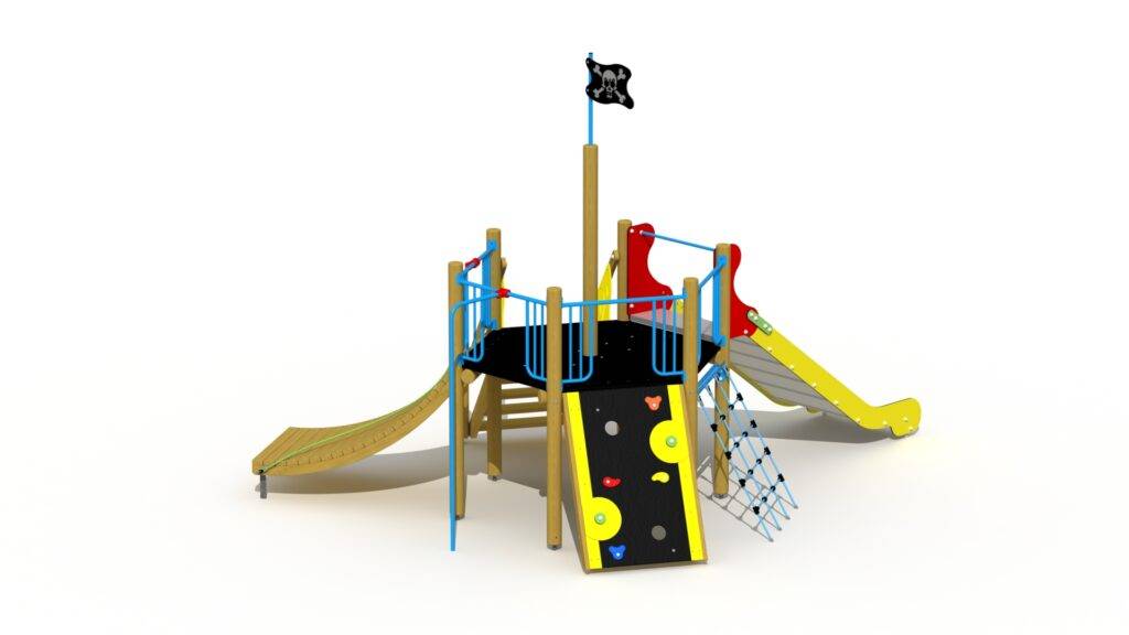Über eine bequeme Treppe geht es hinauf auf die zentrale Plattform. Dort sorgen bunte Geländer und die Piratenflagge für echtes „Schiff-auf-See“-Gefühl. Mutige Kinder erobern den Turm über das Kletternetz oder die schräge Kletterrampe mit Halteleine und eingearbeiteten Stufen, die auch Einsteiger sicher nach oben bringt. Eine Kletterwand mit farbigen Griffen fordert die Koordination heraus, während eine niedrige Rutschstange für rasante Abfahrten sorgt.