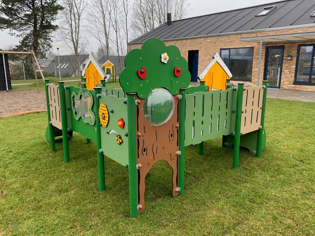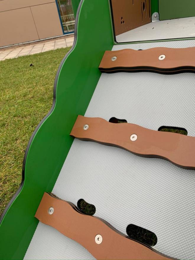 Der Einstieg gelingt ganz kindgerecht - entweder über die niedrige Treppe mit Griffen oder über die Krabbelrampe. Gerade dort wird spielerisch trainiert, was in diesem Alter so wichtig ist: Grobmotorik, Gleichgewicht und die sichere Koordination von Armen und Beinen. Oben angekommen, wird es spannend: Von den Brücken aus können Kinder ihre Umgebung durch große Fenster beobachten oder sich kleine Rollenspiele ausdenken. Das große Fenster in der 'Baumkrone' wirkt wie ein Aussichtspunkt - und darunter wartet die verborgene Höhle als gemütliches Versteck.