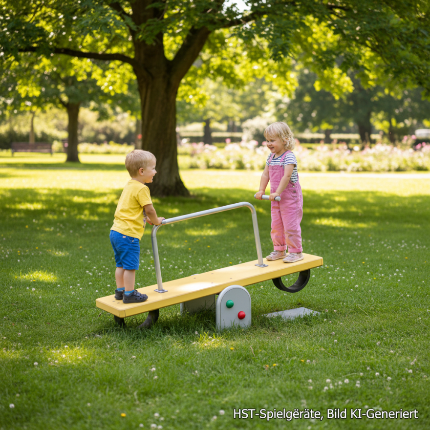Gerade im Kindergartenalter ist die Sozialwippe ein echtes Lieblingsgerät: Sie fordert Körpergefühl, Gleichgewicht und Koordination - und stärkt gleichzeitig das soziale Miteinander. Denn ohne Abstimmung klappt es nicht: Mal wartet man, mal zählt man gemeinsam an, mal hilft man dem anderen beim sicheren Aufsteigen. Bei HST-Spielgeräte steht genau dieses Zusammenspiel aus Bewegung, Lernen und Freude im Vordergrund.