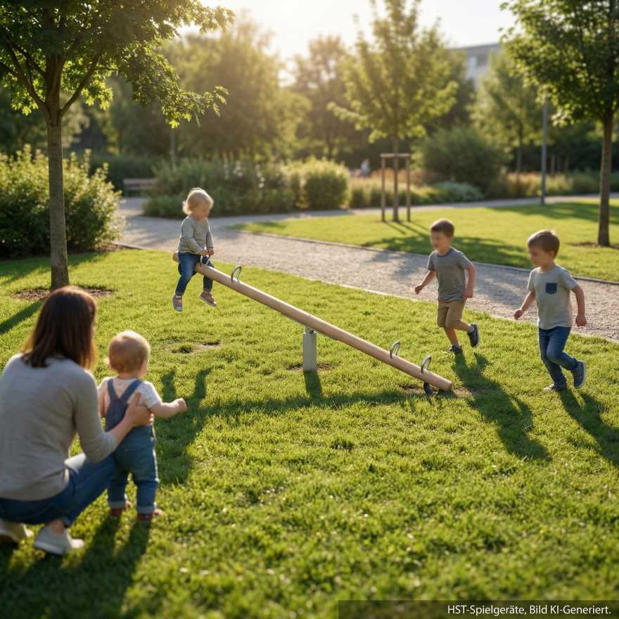 Auch motorisch steckt richtig viel drin: Beim Festhalten, Abdrücken und Ausbalancieren werden Körperspannung, Koordination und Gleichgewicht trainiert. Kinder spüren Ursache und Wirkung unmittelbar - ein bisschen stärker drücken, ein bisschen früher reagieren - und schon verändert sich der Rhythmus. Genau dieses direkte Feedback macht Wippen so faszinierend und sorgt dafür, dass die Holzwippe immer wieder neu ausprobiert wird. Bei HST-Spielgeräte steht dabei das aktive Erleben im Vordergrund: gemeinsam spielen, sich bewegen, besser werden - und dabei ganz viel Spaß haben.
